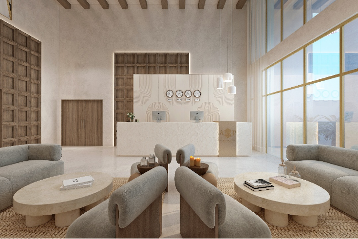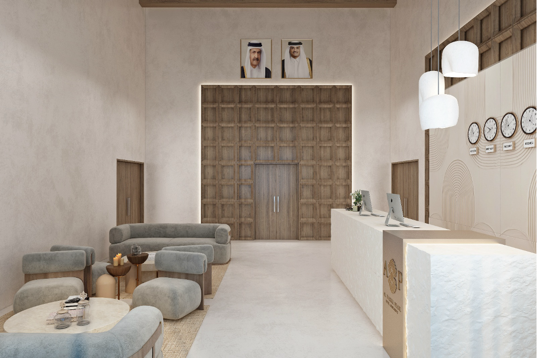 في الداخل، يستقبل اللوبي الرئيسي الزوار بفضاء رحب تملؤه الإضاءة الطبيعية القادمة عبر واجهة زجاجية عالية، فيمَا تمنح الجدران المحفورة والأبواب الخشبية الكبيرة إحساسًا بالقوة والأصالة. يتوسط المشهد كاونتر استقبال من الرخام الفاتح، في حين تظهر العوارض الخشبية في السقف روح العمارة القطرية التقليدية. وتكتمل الأجواء بمناطق جلوس مريحة، أثاث بخامات طبيعية، وسجاد متناسق يعزز دفء الفراغ.