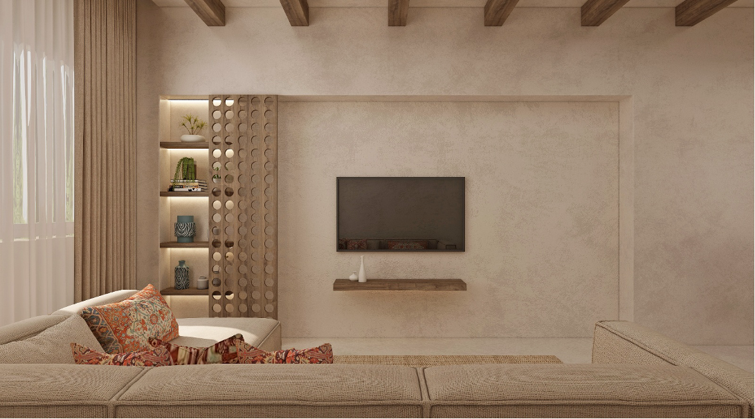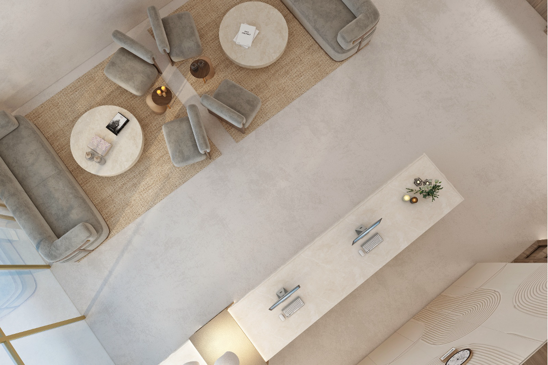 اللوبي الجانبي يتميز بأرضيات حجرية فاتحة تتخللها مسارات عشوائية التكوين، وسقف انسيابي بإضاءة محيطية تبرز دفء الجدران الرملية. فتحات جدارية مقوسة تحتوي على عناصر ديكورية مضاءه، بينما يضيف الكونصول الخشبي مع المرايا العضوية لمسة فاخرة متوازنة.