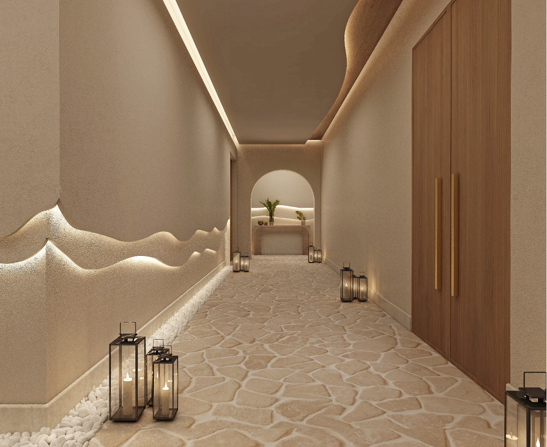 تتوزع الممرات الداخلية تحت أقواس معمارية أنيقة بإضاءات جدارية خافتة، وأرضيات حجرية منسجمة مع تكوينات الجدران. أما المدخل الثانوي، فيتخذ سقفًا مقوسًا مزوّدًا بإضاءات خطية تمنح إحساسًا ترحيبيًا دافئًا.