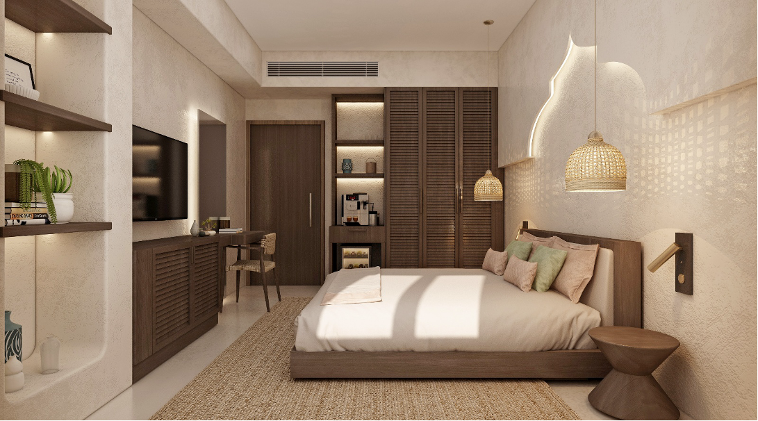 أما أجنحة الغرف، فهي ملاذ خاص حيث يندمج الخشب الطبيعي في الأسقف مع الأثاث البيج وأرفف مدمجة، بينما تمنح وحدات الإضاءة المستوحاة من سعف الخوص من التراث القطري أنماطًا ضوئية مميزة. خلفية السرير المضيئة تحمل تصميمًا عربيًا أيقونيًا، يظهر هُوِيَّة المكان ويضفي على الغرفة طابعًا دافئًا وراقيًا.