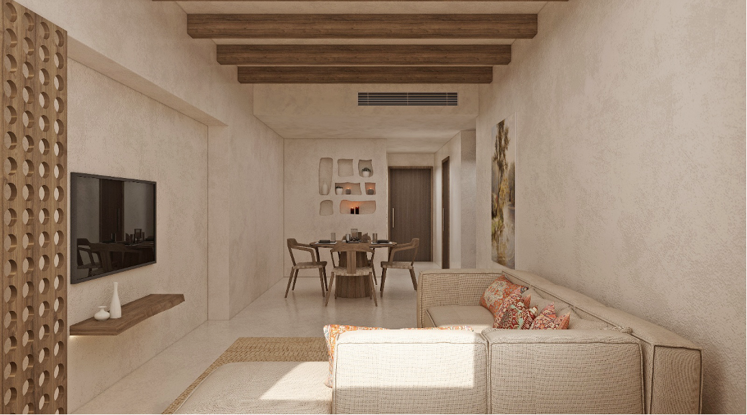 أما أجنحة الغرف، فهي ملاذ خاص حيث يندمج الخشب الطبيعي في الأسقف مع الأثاث البيج وأرفف مدمجة، بينما تمنح وحدات الإضاءة المستوحاة من سعف الخوص من التراث القطري أنماطًا ضوئية مميزة. خلفية السرير المضيئة تحمل تصميمًا عربيًا أيقونيًا، يظهر هُوِيَّة المكان ويضفي على الغرفة طابعًا دافئًا وراقيًا.