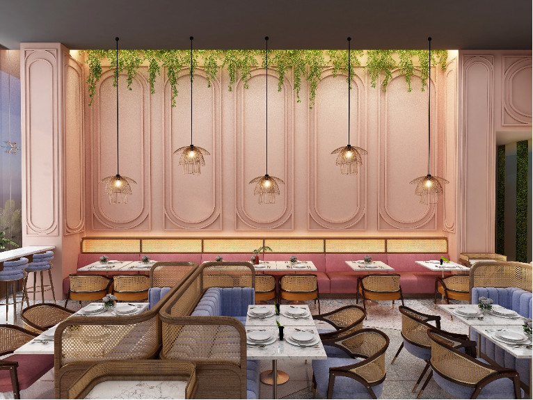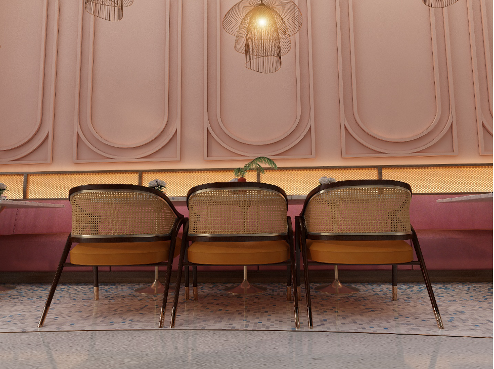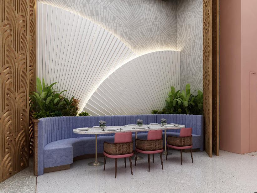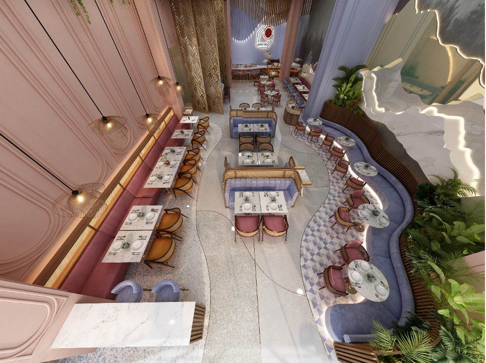 في عمق المطعم، تبرز الفلسفة التصميمية من خلال توزيع الطاولات الذي يُراعي تنوّع الزبائن وحرية الحركة، مع الحفاظ على خصوصية كل مجموعة.