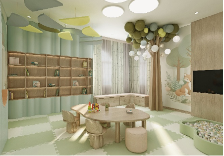 غرفة ألعاب الأطفال: صُمّمت هذه المساحة بعناية لتلبي احتياجات الأطفال النفسية والوظيفية معاً؛ فأرضيات الفينيل الآمنة تمنحهم حرية الحركة، فيمَا تضفي الألوان المبهجة أجواءً مليئة بالحيوية. كما أُدرجت مكتبة صغيرة تُحفّز حب القراءة وتنمي خيالهم، إلى جانب أثاث مُصمَّم خصيصًا ليناسب أحجامهم، ويوفر بيئة تعليمية وترفيهية متكاملة توازن بين الراحة والإبداع.