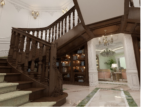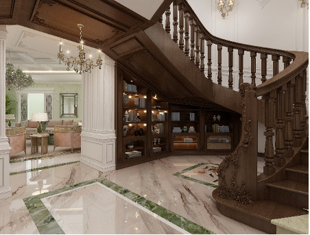 جاء الطابق الأرضي بتصميم كلاسيكي بحت مستوحى من الطراز البريطاني، حيث تم استغلال المساحات غير المستخدمة أسفل السلالم وتحويلها إلى مكتبة راقية مزوّدة بوحدات إضاءة مدروسة، تعزّز من عمق المشهد العام وتضيف لمسة وظيفية أنيقة. أما الأسقف، فغُلّفت بالكامل بالخشب الطبيعي، مما عزّز الإحساس بالدفء والراحة. وتم تنفيذ قطع الأثاث بطابع كلاسيكي مصمم خصيصًا حسب رغبة العميل، لتتناسق بدقة مع هوية المشروع وتفاصيله المعمارية الدقيقة.