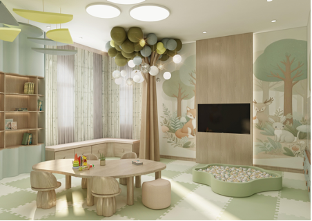 غرفة ألعاب الأطفال: صُمّمت هذه المساحة بعناية لتلبي احتياجات الأطفال النفسية والوظيفية معاً؛ فأرضيات الفينيل الآمنة تمنحهم حرية الحركة، فيمَا تضفي الألوان المبهجة أجواءً مليئة بالحيوية. كما أُدرجت مكتبة صغيرة تُحفّز حب القراءة وتنمي خيالهم، إلى جانب أثاث مُصمَّم خصيصًا ليناسب أحجامهم، ويوفر بيئة تعليمية وترفيهية متكاملة توازن بين الراحة والإبداع.