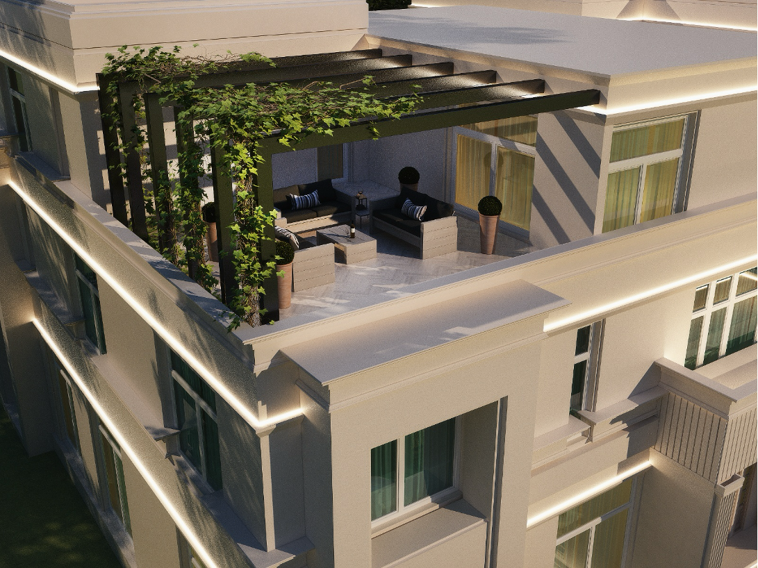 تم استغلال المساحة الرأسية للفيلا بذكاء، حيث تم تحويل السطح إلى مساحة واسعة حيث جُهز السطح ليضم حديقة روف رحبة تحتضن جَلسة خارجية، تحيط بها نباتات متسلقة تضيف حيوية ودفئًا للمكان، وتوفر أجواء مريحة للاسترخاء أو استقبال الضيوف.