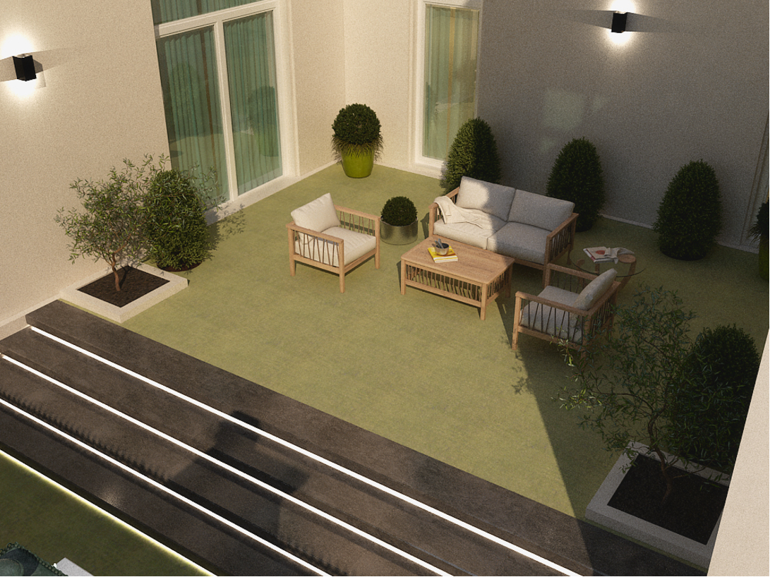 كما تتميز الفيلا بحديقة ثانوية ذات تصميم هندسي مربع، تحيط بها جدران المبنى بالكامل لتأمين خصوصية استثنائية. في قلب هذه الحديقة، تنتظم جَلسة خارجية أنيقة بأثاث خشبي طبيعي وتفاصيل بسيطة راقية، تشكل امتدادًا متناغمًا للمساحات الداخلية وتتيح تجرِبة استمتاع بالهواء الطلق وَسَط أجواء هادئة وآمنة.