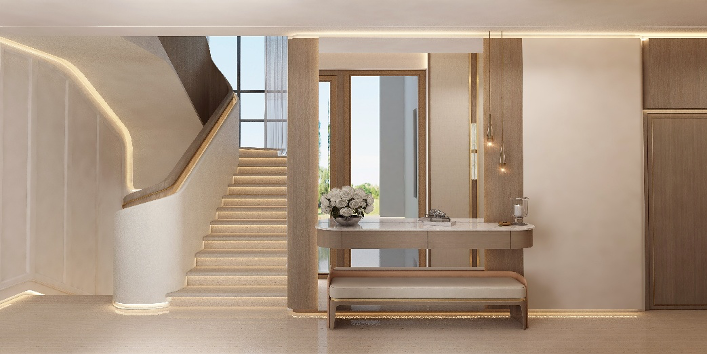ينطلق المشهد من مدخل متناظر يكتسي بالرخام الطبيعي، يتكامل مع ابواب خشبية فخمة ومرايا ممتدة تعزّز الإحساس بالاتساع. وحدات الإضاءة المتدلّية بتصميم انسيابي نحتي تُضفي على الفراغ لمسة ناعمة