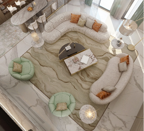 جلسة بشكل حرف L عريضة تنبض بالراحة وتحتضن الأسرة، بلون بيج دافئ وكسرات خضراء تتوسطها طاولة رخامية باللون البيج . مع إضاءة مخفية ( سبوت لايت) ، لتضفي حركة خفيفة على الطابع العام . على الجانب، طاولة طعام صغيرة وخزانة مفتوحة كفاصل بصري ناعم يحافظ على خصوصية المساحة دون عزلها.