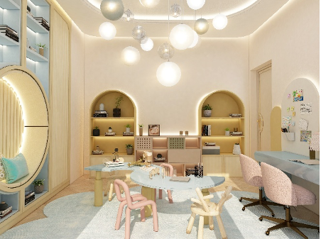 تضم ركنًا هادئًا للقراءة، مكتبًا للمذاكرة، وزوايا للعب. الخزائن والأرفف جاءت بمنحنيات ناعمة، والمواد المستخدمة آمنة وسهلة التنظيف، ما يجعلها مساحة آمنة وممتعة في آن واحد