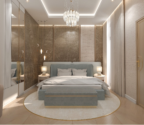 تتقدّم المشهد غرفة النوم، بأثاث مصمّم حسب الطلب يتصدّره سرير بتنجيد ناعم يوازي جدارًا مكسوًا بورق حائط ذهبي بنقوش دقيقة، تتناغم معه وحدات الإضاءة المعلّقة والمرايا الرأسية التي تخلق إحساسًا بالاتساع والعمق، وتستقر على الأرض سَجادة بتدرّجات دافئة مستوحاة من ألوان الطبيعة.