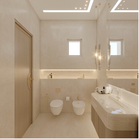 ويكتمل هذا التكوين بوجود الحمام الداخلي الذي جاء بتكسية كاملة من الرخام العاجي للأرضيات والجدران، فيما أضفت المغسلة المنحنية والإضاءة الجانبية المدروسة شعورًا بالسكينة والراحة، يوازن بدقة بين طابع الفخامة ومتطلبات الاستخدام العملي.