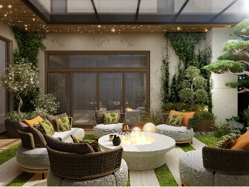 يشكّل الفناء مساحة تأملية فريدة تجمع بين العناصر الطبيعية والعناصر المعمارية. تتوسّط الجلسة الدائرية مدفأة أنيقة، تحيط بها نباتات متسلقة وشجرة بتشكيل نحتي، تعلوها قبة بسقف زجاجي تسمح بتسلل الضوء الطبيعي نهارًا، وتكتمل التجربة بإضاءة ليلية موزعة تنسج أجواء شاعرية
