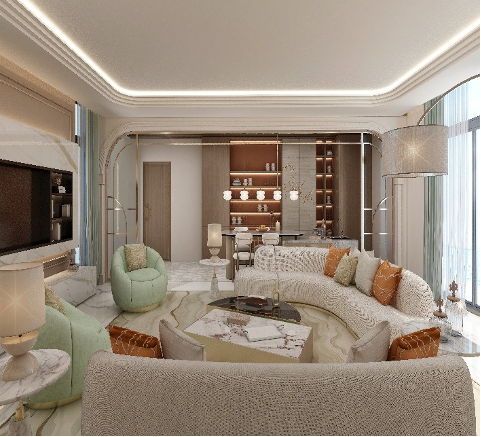 جلسة بشكل حرف L عريضة تنبض بالراحة وتحتضن الأسرة، بلون بيج دافئ وكسرات خضراء تتوسطها طاولة رخامية باللون البيج . مع إضاءة مخفية ( سبوت لايت) ، لتضفي حركة خفيفة على الطابع العام . على الجانب، طاولة طعام صغيرة وخزانة مفتوحة كفاصل بصري ناعم يحافظ على خصوصية المساحة دون عزلها.