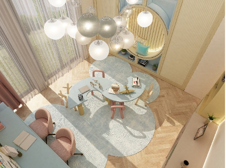 تضم ركنًا هادئًا للقراءة، مكتبًا للمذاكرة، وزوايا للعب. الخزائن والأرفف جاءت بمنحنيات ناعمة، والمواد المستخدمة آمنة وسهلة التنظيف، ما يجعلها مساحة آمنة وممتعة في آن واحد