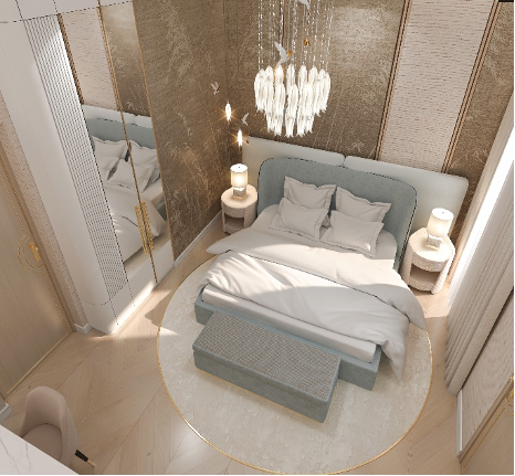 تتقدّم المشهد غرفة النوم، بأثاث مصمّم حسب الطلب يتصدّره سرير بتنجيد ناعم يوازي جدارًا مكسوًا بورق حائط ذهبي بنقوش دقيقة، تتناغم معه وحدات الإضاءة المعلّقة والمرايا الرأسية التي تخلق إحساسًا بالاتساع والعمق، وتستقر على الأرض سَجادة بتدرّجات دافئة مستوحاة من ألوان الطبيعة.