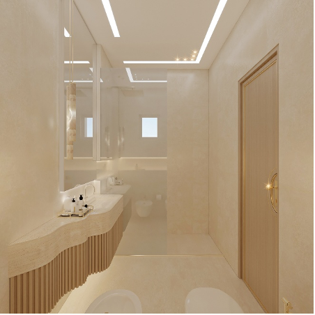ويكتمل هذا التكوين بوجود الحمام الداخلي الذي جاء بتكسية كاملة من الرخام العاجي للأرضيات والجدران، فيما أضفت المغسلة المنحنية والإضاءة الجانبية المدروسة شعورًا بالسكينة والراحة، يوازن بدقة بين طابع الفخامة ومتطلبات الاستخدام العملي.