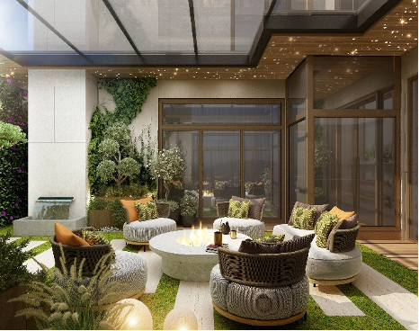يشكّل الفناء مساحة تأملية فريدة تجمع بين العناصر الطبيعية والعناصر المعمارية. تتوسّط الجلسة الدائرية مدفأة أنيقة، تحيط بها نباتات متسلقة وشجرة بتشكيل نحتي، تعلوها قبة بسقف زجاجي تسمح بتسلل الضوء الطبيعي نهارًا، وتكتمل التجربة بإضاءة ليلية موزعة تنسج أجواء شاعرية