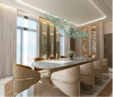 تتربّع في المساحة طاولة طعام رخامية بتكوين مائل إلى الأخضر وسط غرفة الطعام الرسمية، تحيط بها كراسي مخملية بلون محايد وتفاصيل رقيقة من المعدن باللون الذهبي. وتضيء المكان ثريا زجاجية بتكوينات فيروزية تُضفي إيقاعًا بصريًا متناغمًا، فيما تتوزّع على الجدران خزائن عرض مدمجة ومضاءة تضيف بُعدًا وظيفيًا دون الإخلال بجو الفخامة.
