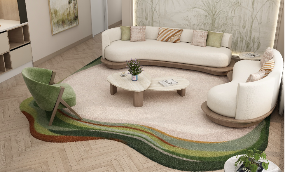 أما جلسة المعيشة، فتمحورت حول أريكة نصف دائرية بلون محايد، تتوسطها طاولة بتصميم عضوي، وتكتمل مع كرسي أخضر نحتي وكاربت مخصص بتدرجات لونية ترابية تحاكي انسيابية خطوط الأرضية.