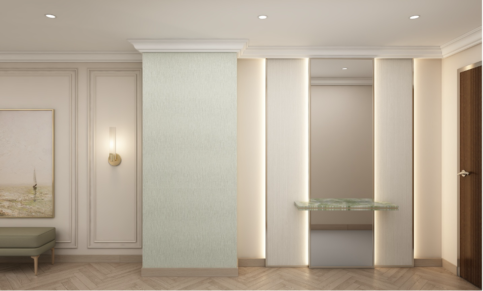 مدخل الشقة يعكس ذات اللغة التصميمية الراقية، حيث يبرز تجويف رخامي أخضر أنيق يمنح لمسة فخامة طبيعية، تتوسطه وحدة كونسول معلّقة بتصميم انسيابي يعزز الإحساس بالخفة. يكتمل المشهد بمرآة مضاءة من الخلف، تعمل على توسيع الإحساس البصري بالمساحة، وتضيف عمقاً وبعداً يثريان جمالية المكان منذ اللحظة الأولى للدخول.