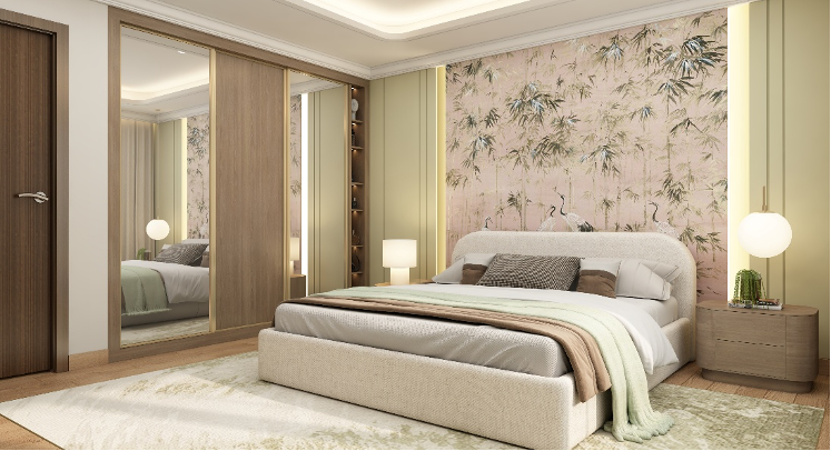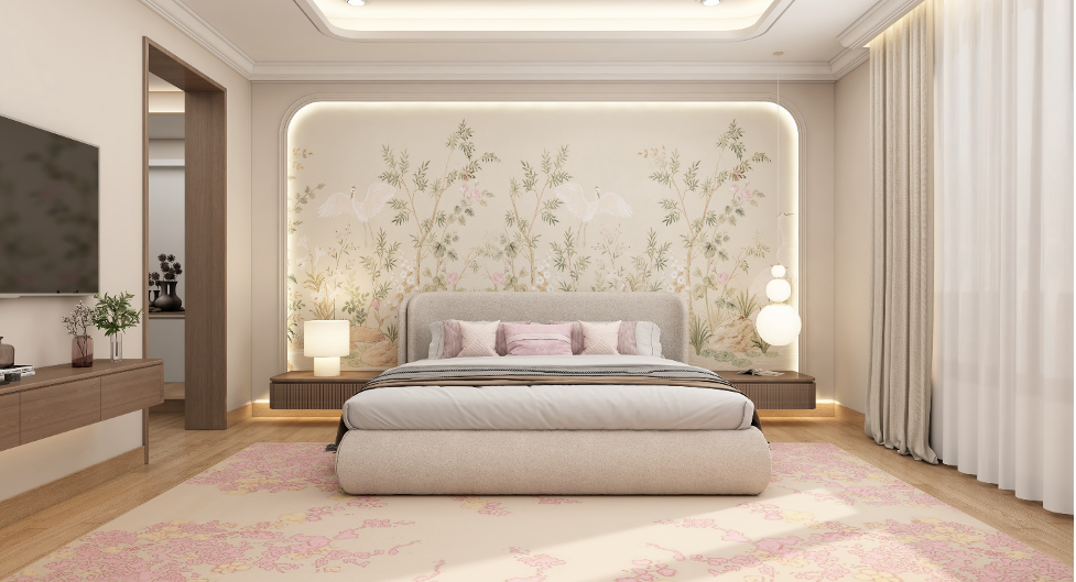 تحمل غرفة النوم الرئيسية طابعًا ناعمًا يوازن بين الراحة والرفاهية. تتصدر الجدار الخلفي جدارية يدوية برسوم مستوحاة من الطبيعة، محاطة بإطار جبسي مقوس مع إضاءة خفية تعزّز تفاصيلها.