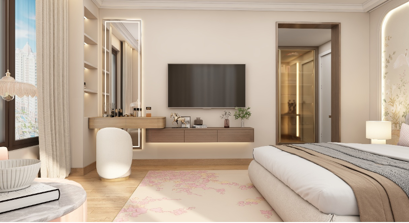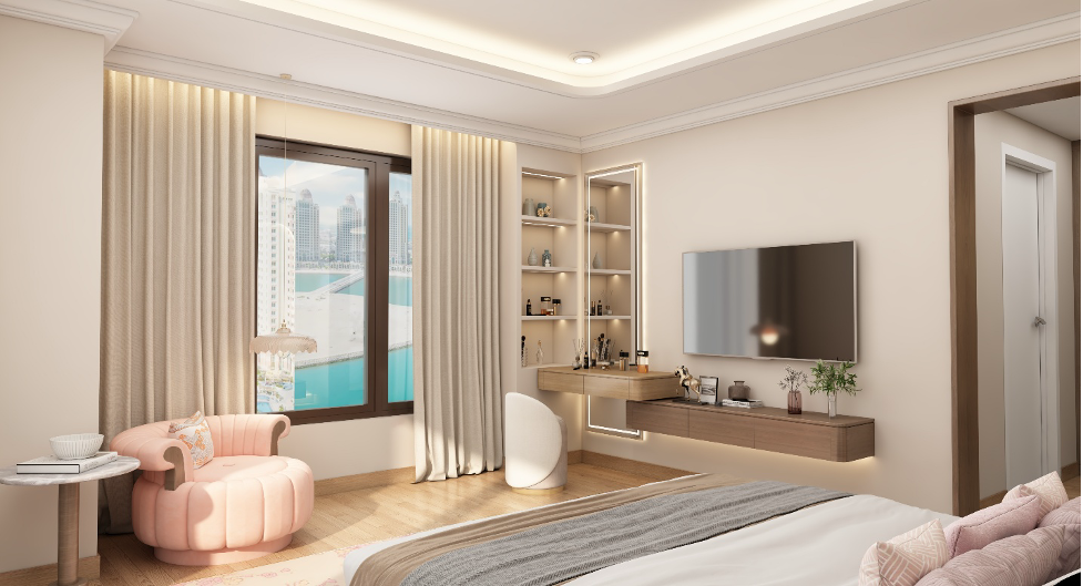 على الجدار المقابل، صُمّمت وحدة تلفاز طافية متصلة بدرج تسريحة مدمج، يضم مرآة طولية وأرفف مخفية وإضاءة متدرجة تُسهّل الاستخدام دون المساس بجمالية الغرفة.
