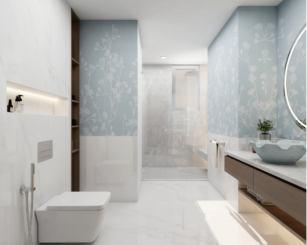 الأحواض جاءت بتصميم ناعم وانسيابي، والمقابض باللون الفضي المطفي تضيف لمسة فاخرة، فيما توزعت الإضاءة بين المباشرة وغير المباشرة بما يناسب الاستخدامات المختلفة ويعزز الهدوء في المكان.